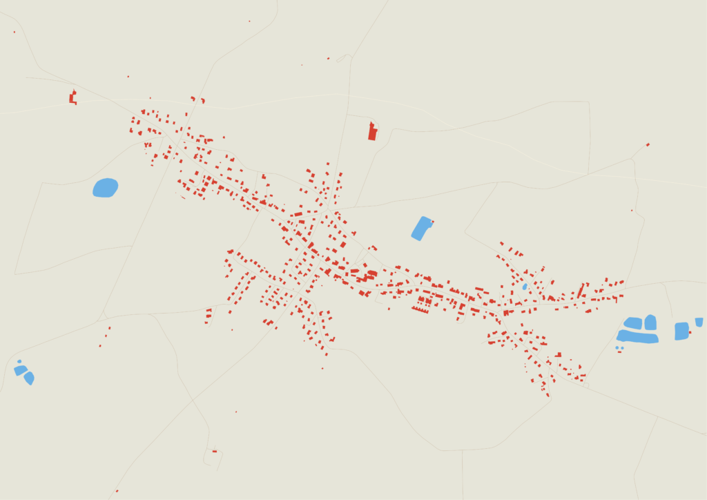 Les bâtiments, soulignés par le rouge, révèlent la densité, le rythme et l’organisation des villes, tandis que les éléments naturels et les infrastructures apportent respiration et équilibre.